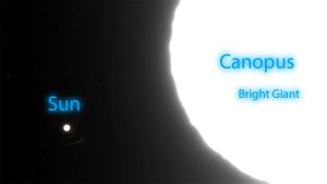 Karina takımyıldızı yönünde sistemimizden 310 ışık yılı uzaklıkta bulunan Canopus, Güneş’ten çok daha fazla enerji yayan ve sarı-beyaz renkte oldukça parlak bir yıldızdır. Kütlesi Güneş’ten 11 kat, çapı ise 70 kat daha büyüktür. Güneş’in çapını 1,4 milyon km olarak alırsak bu Canopus yıldızının çapının yaklaşık 98 milyon km olduğu anlamına geliyor. Yani eğer Güneş’in yerinde olsaydı Merkür’ü içine alacak Venüs’ün yörüngesine kadar gelecek, güzelim gezegeni yakıp kavuracaktı.